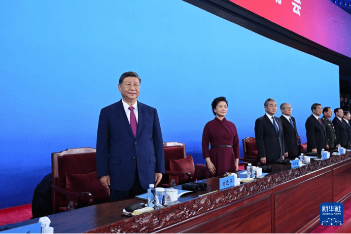 入场仪式完毕,全场起立,高唱中华人民共和国国歌。在雄壮的国歌声中,五星红旗冉冉升起、高高飘扬。
