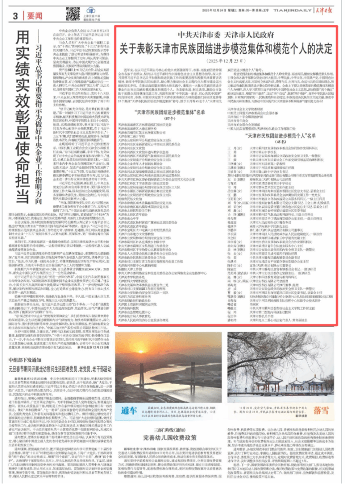 近年来,在以习近平同志为核心的党中央坚强领导下,市委、市政府团结带领全市各族干部群众,坚持以习近平新时代中国特色社会主义思想为指导,深入学习贯彻习近平总书记关于加强和改进民族工作的重要思想和视察天津重要讲话精神,铸牢中华民族共同体意识,凝心聚力推动社会主义现代化大都市建设迈出新的坚实步伐。在推动高质量发展的火热实践中,涌现出一大批为民族团结进步事业作出突出贡献的模范集体和模范个人。为表彰先进、树立典型,激励全市各族干部群众共同做好民族工作,巩固和发展“中华民族一家亲、同心共筑中国梦”的良好局面,市委、市政府决定授予天津市滨海新区古林街道福汇园社区党委等57个集体“天津市民族团结进步模范集体”称号,授予王丹等45名个人“天津市民族团结进步模范个人”称号。